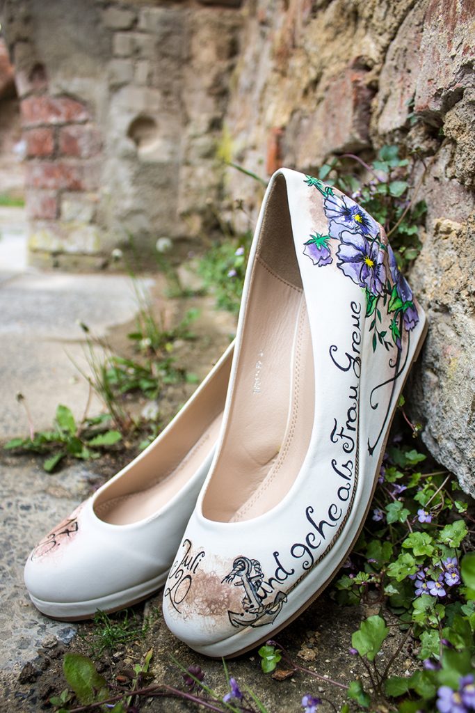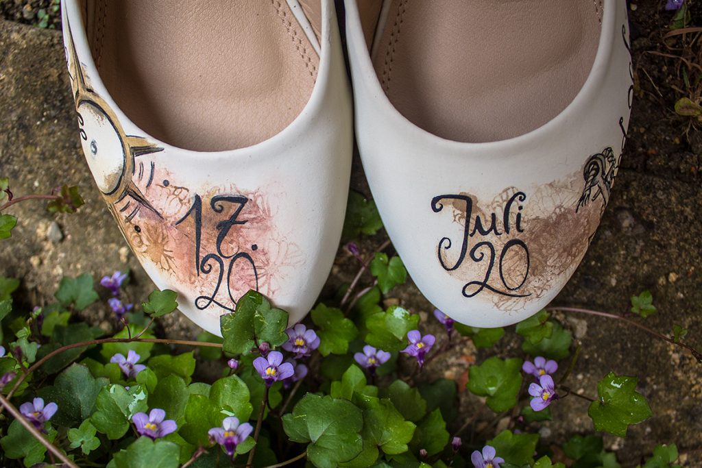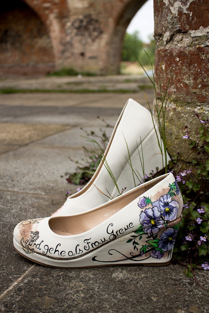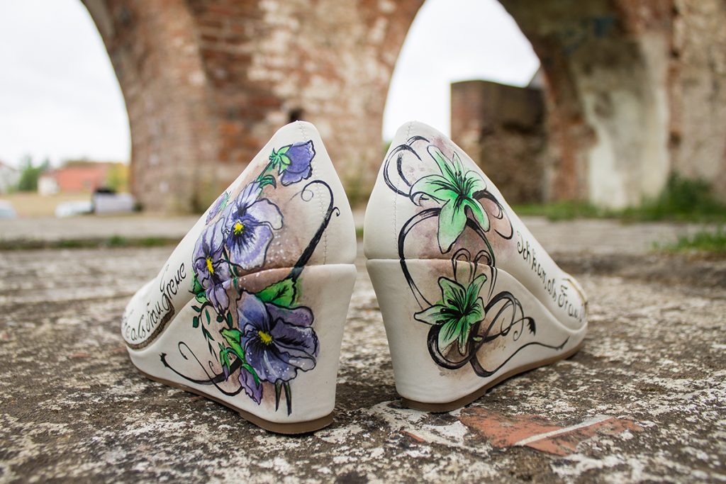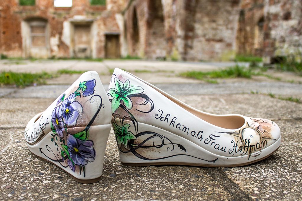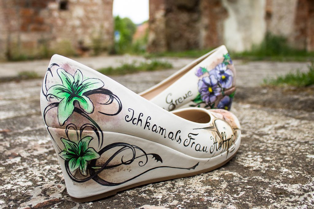 Florales Design mit Ihrem Motto und dem Datum der Trauung auf beiden Schuhen verteilt. Der Keilabsatz wurde hier in die Gestaltung integriert.