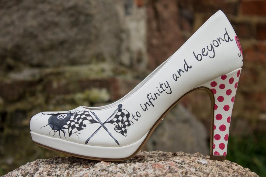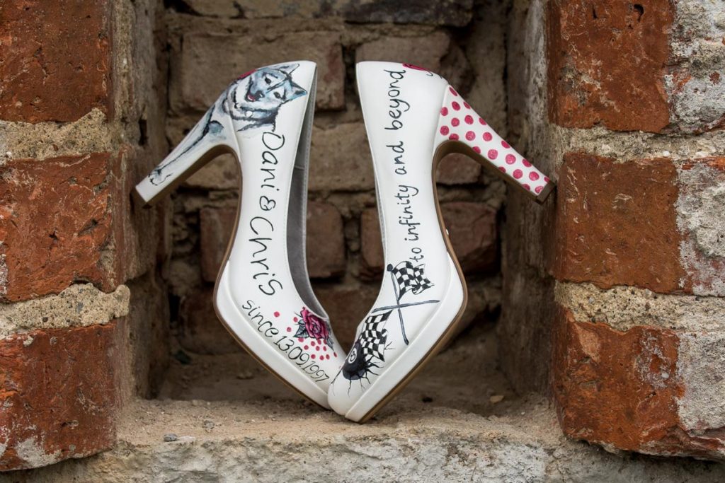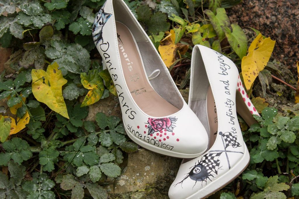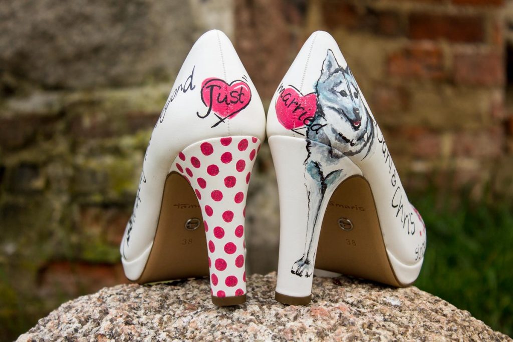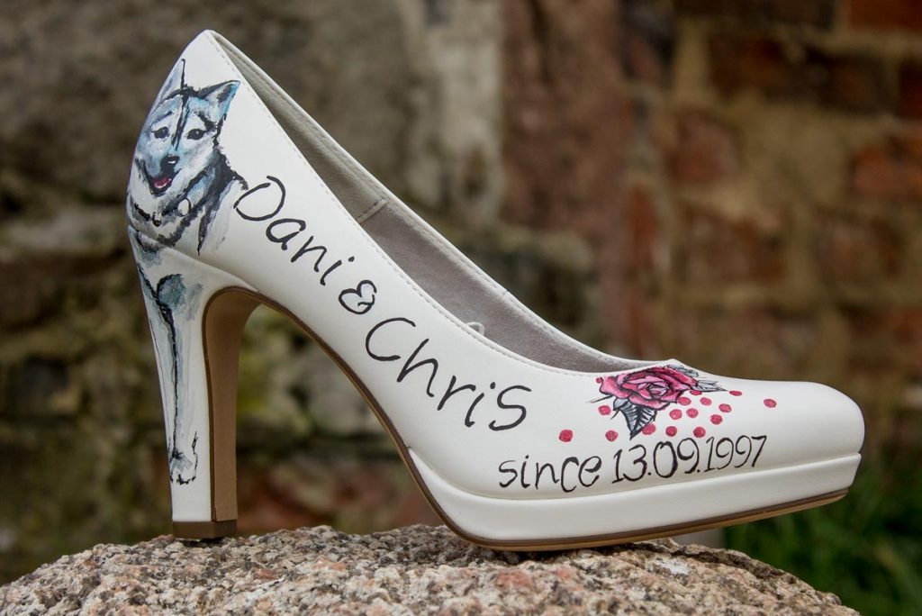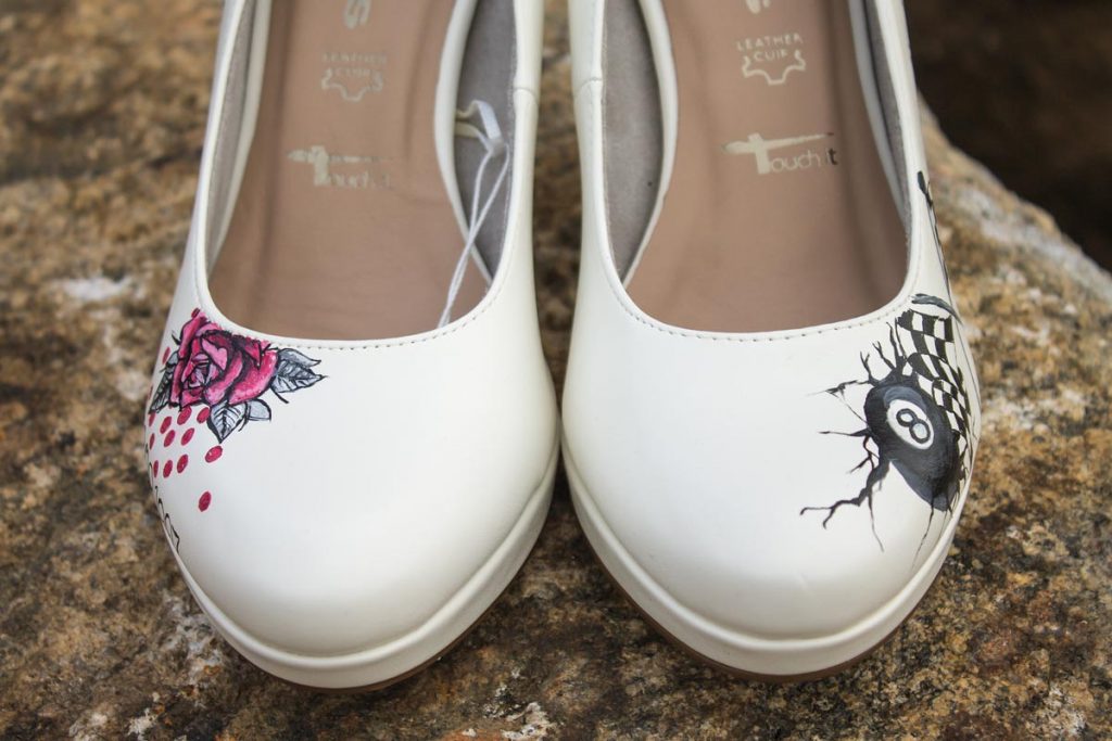 Im Rockabilly Stil wurde geheiratet, also mussten auch die Schuhe passend gestaltet werden. Hier ist es ganz offensichtlich, was gewünscht war: das Motto und die Namen zusammen mit ihrem Hund und Rockabilly Elementen waren dieser Braut besonders wichtig.